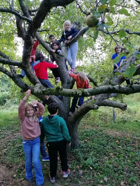 Wir haben Äpfel gesammelt was das Zeug hält. Greta, Esra und ich haben für die Klasse Äpfel gesammelt, das durften wir ganz alleine. Dann sind wir auf den Baum geklettert. Dann habe ich mit Hannes die Äpfel zerkleinert und ich habe Apfelsaft gepresst. Dann haben wir den Saft probiert und sind zurück zur Schule gelaufen. Von Paula