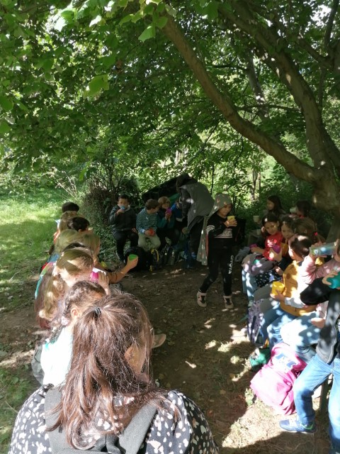 Wir sind 20 Minuten hingegangen und wir haben Äpfel gesammelt. Dann haben wir Äpfel gepresst. Wir haben kleine Vogeleier gesehen und sind 10 Minuten bis zur SKB zurückgegangen. Von Maxime